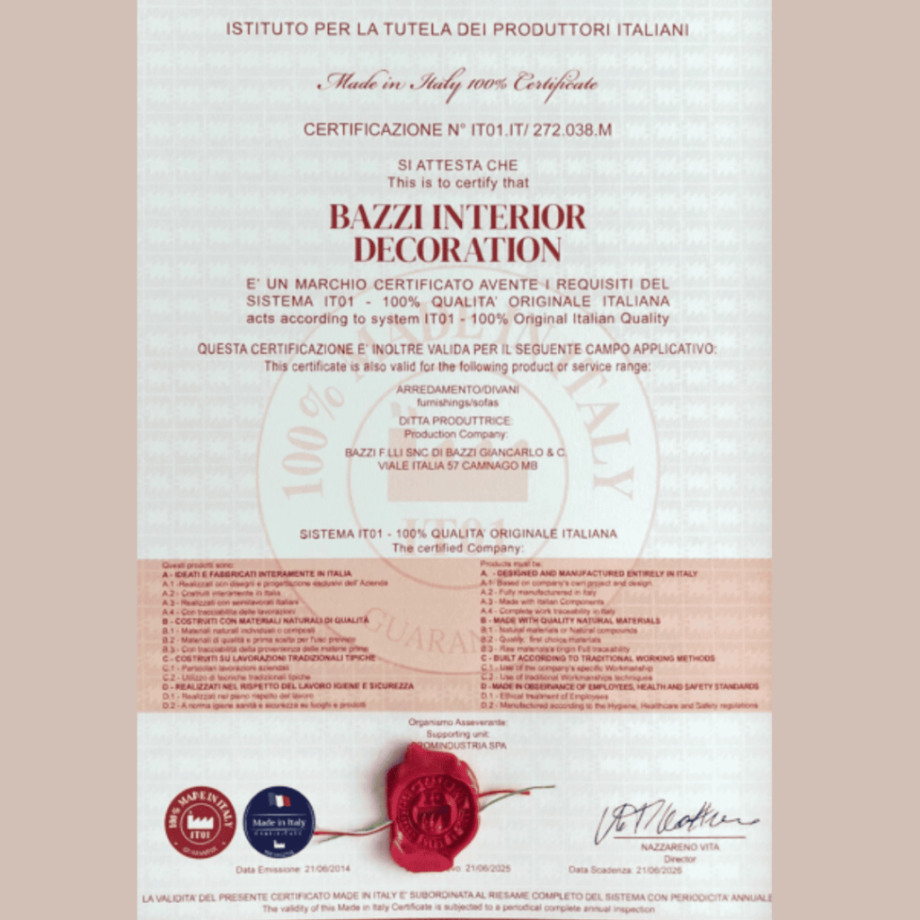 La certificazione “100% Made in Italy” garantisce che ogni fase del processo produttivo avvenga in Italia, con materiali naturali, locali, e sostenibili.